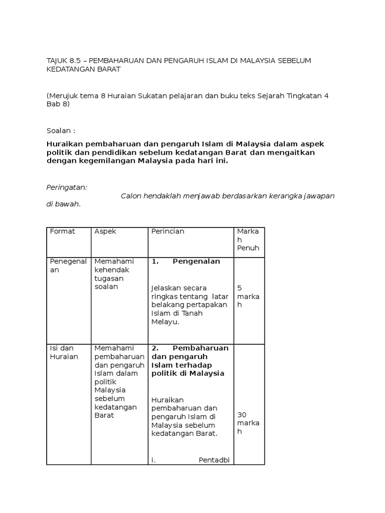 Contoh Soalan Esei Sejarah Bab 8 Tingkatan 5Contoh jawapan terbaik soalan 1. PEMBAHARUAN DAN PENGARUH ISLAM DI MALAYSIA SEBELUM KEDATANGAN BARAT 12492 Sejarah Kertas II 2 Nag2oO9 o Tempat menyimpan buku-buku hikayat o Pusat pendidikan ilmu politik dan pentadbiran 6 x 1m Mak. Soalan dan Jawapan Tutorial Tingkatan 4 Bab 8.